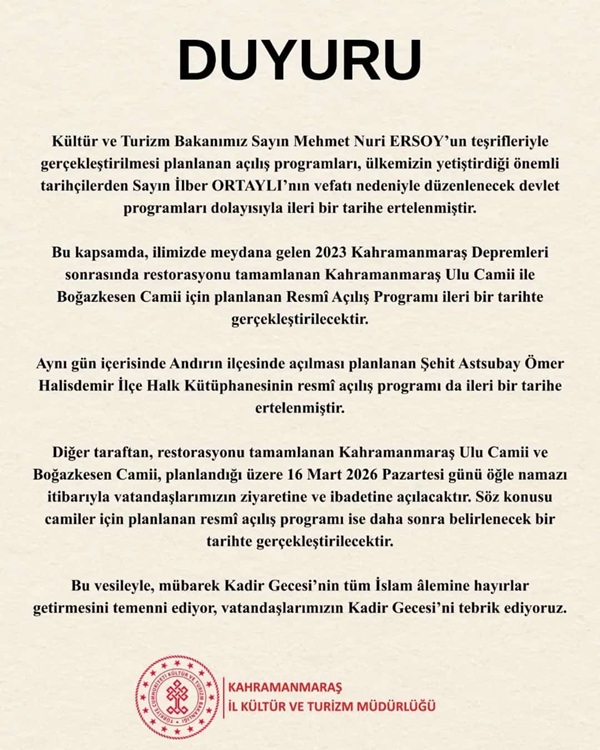 Öte yandan restorasyonu tamamlanan Kahramanmaraş Ulu Camii ve Boğazkesen Camii’nin, planlandığı üzere 16 Mart 2026 Pazartesi günü öğle namazı itibarıyla vatandaşların ziyaretine ve ibadetine açılacağı ifade edildi. Camiler için yapılacak resmi açılış programının ise daha sonra belirlenecek bir tarihte gerçekleştirileceği kaydedildi.
